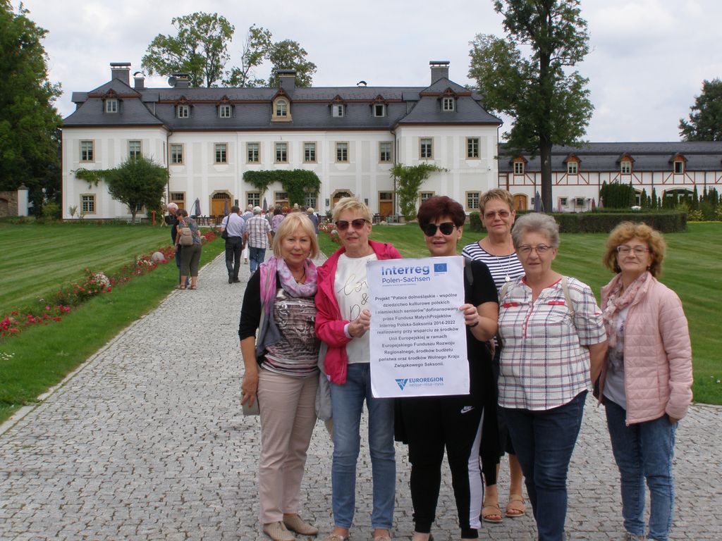 Beneficjenci projektu: Beneficjent wiodący – Stowarzyszenie Przyjaciół Uniwersytetu Trzeciego Wieku Żarskiego Domu Kultury „Aktywny Senior”, ul. Wrocławska 7, 68-200 Żary, e-mail: stowarzyszenieaktywnysenior@gmail.com; Partner projektu – Seniorenclub Kraftwerk Boxberg e.V.Weisswasser, Chauseestrasse 23, 10115 Weisswasser, e-mail: gerd.quander@t-online.de Projekt zakładał organizację i przeprowadzenie dwudniowej wycieczki autobusowej seniorów z Polski i z Saksonii do Doliny Pałaców i Ogrodów. Działanie miało miejsce 12-13 września 2019 r. Seniorzy w trakcie tego spotkania integracyjnego zwiedzili Muzeum Karkonoskie w Jeleniej Górze, Kościół Łaski, Pałac w Łomnicy, Wojanowie, Piechowicach i Staniszowie. Uczestnicy byli informowani nt. źródeł współfinansowania projektu, a także o innych działaniach informacyjno–promocyjnych. Cel: Intensyfikacja współpracy między partnerami projektowymi w obszarze promowania wspólnej historii i kultury wśród seniorów. Rezultatem projektu jest poznanie wspólnej historii i kultury (Muzeum Karkonoskie, Kościół Łaski, Pałac w Łomnicy, Pałac w Wojanowie, Pałac Pakoszów w Piechowicach, Pałac Staniszów) oraz pogłębienie współpracy miedzy partnerami poprzez udział 50 seniorów z Polski i Niemiec w dwudniowej wycieczce. Czas trwania projektu: 25.03.2019 – 23.10.2019. Wartość projektu: 5528,85 EUR, w tym dofinansowanie ze środków Unii Europejskiej w wysokości 85%. Projekt „Pałace dolnośląskie – wspólne dziedzictwo kulturowe polskich i niemieckich seniorów” jest współfinansowany ze środków Europejskiego Funduszu Rozwoju Regionalnego oraz ze środków budżetu państwa w ramach Funduszu Małych Projektów Interreg Polska – Saksonia 2014-2022.