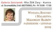 W październikowe, jesienne popołudnie, W Galerii „Zaścianek ” odbył się wernisaż wystawy Małgosi Błażków. Autorka wielu rysunków przedstawiających w większości jej bliskich, skupiła wokół siebie znaczna liczbę gości. Wypełniona po brzegi Galeria rozbrzmiewała serdecznościami przekraczając czas zwykle poświęcany na takie spotkania. Skupiając wokół siebie pozytywną energię tak wielu ludzi, przyjaciół, dostajemy skrzydeł. Artyści amatorzy, profesjonalni… wszyscy tego potrzebują. Odwiedzajcie naszą Galerie. Więcej o artystce można dowiedzieć się tutaj. |